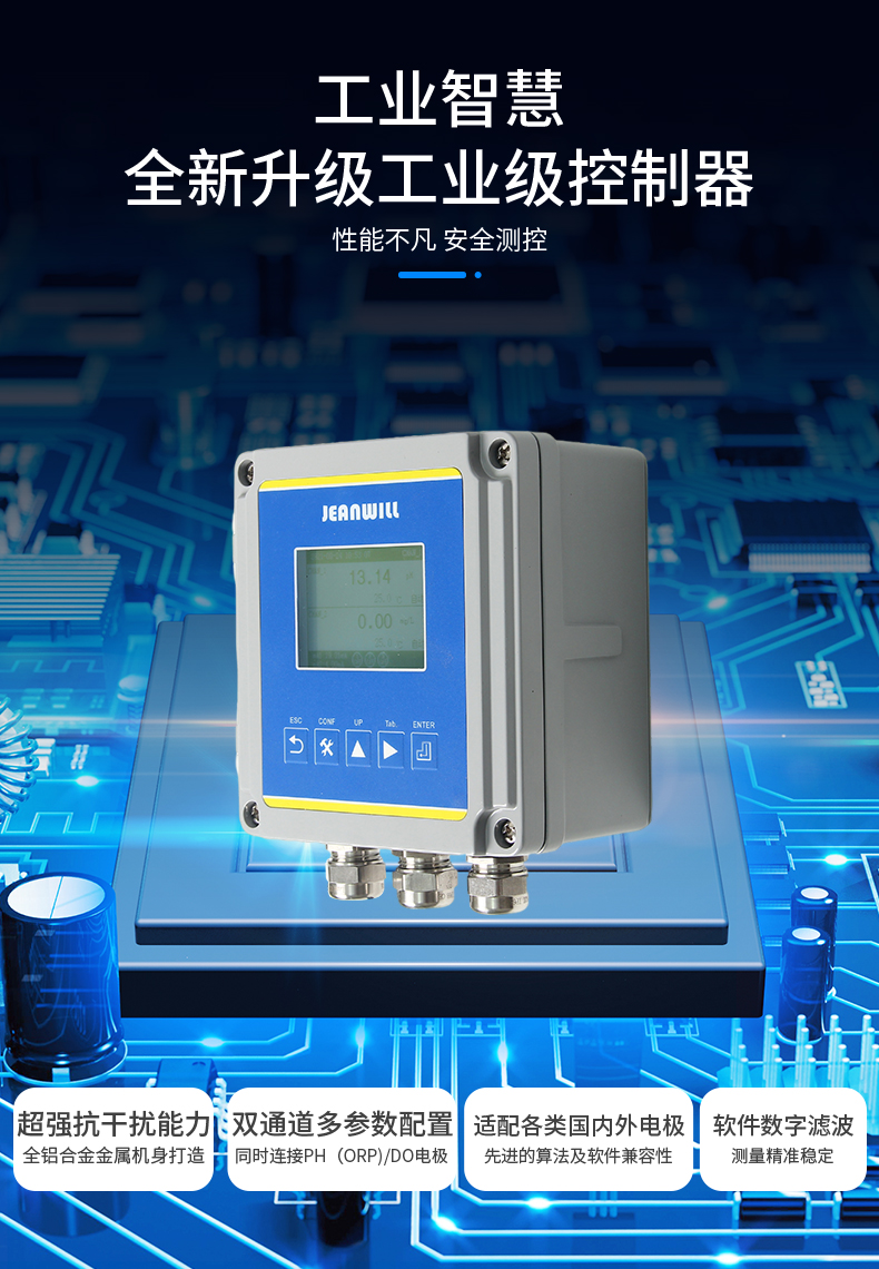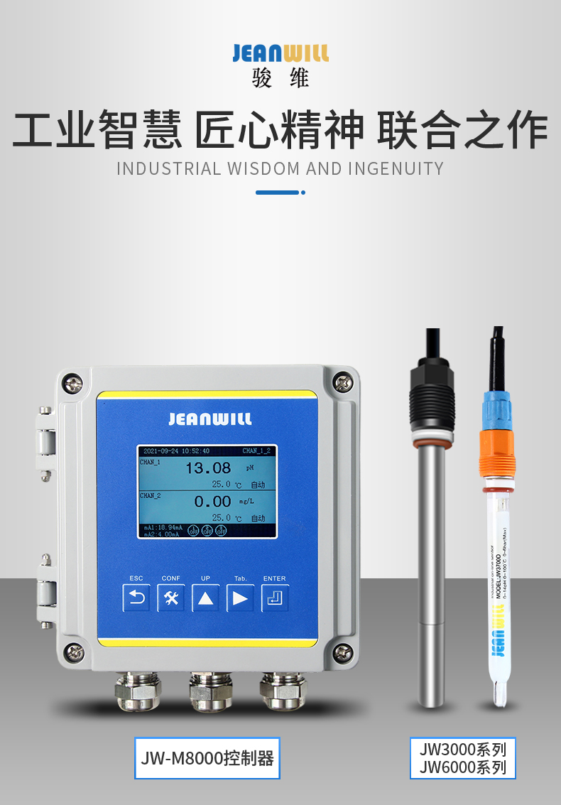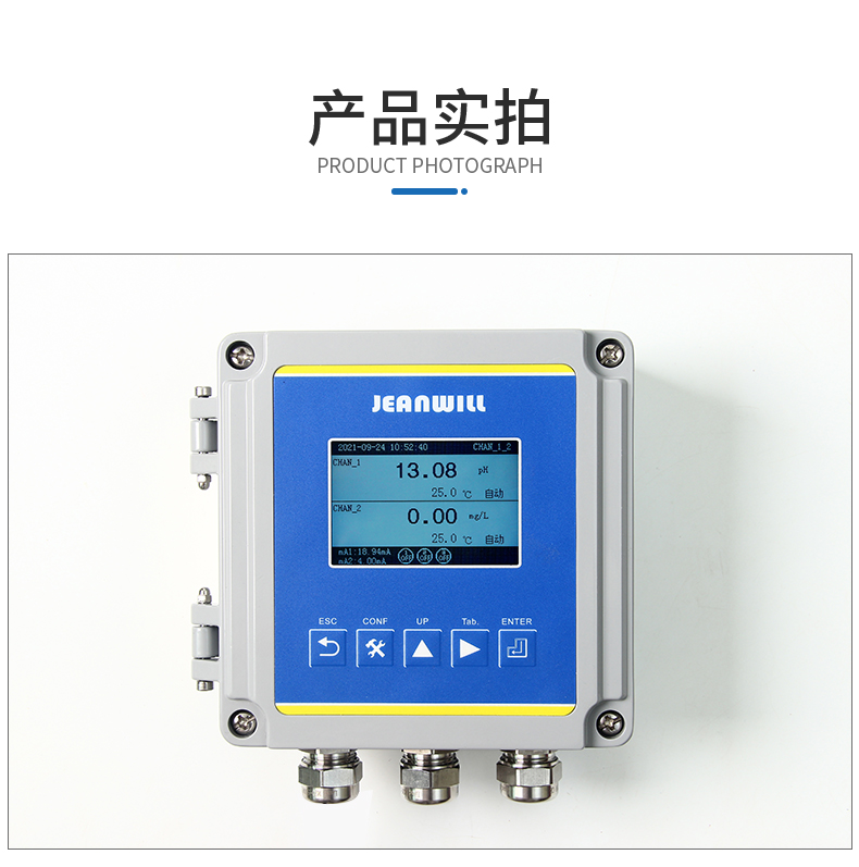JW-M8000系列二合一多参数分析仪采用铝壳设计,是一款用于分析测量的双通道多参数控制器,具备显示、变送、报警及通讯功能,可用于pH/ORP、溶解氧和温度测量,还具有隔爆功能设计,可广泛应用于环保、制药、生化、地表水、食品和自来水等溶液中PH/ORP/DO值的连续监测。