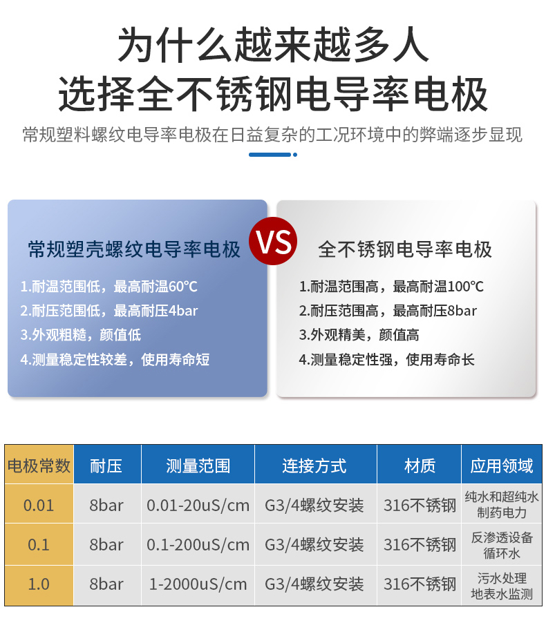 二极式设计,适用于纯水、地表水、污水处理、分渗透设备、循环水、自来水