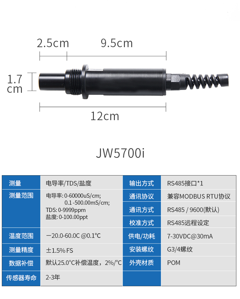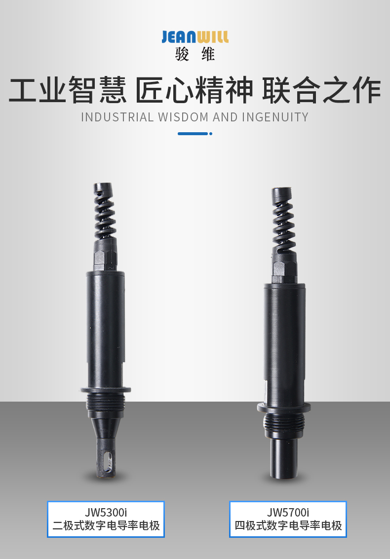 JW5700i电导率电极通过重新考虑电极、最终用户和过程控制系统工之间的通讯,将变送器整合到电极的内部,实现了电极和变送器一体化,传统的变送器功能被内置在电极内的微处理器所取代,该电极可以直接输出RS485信号,其前置电极为四极式哈氏合金电极,具有耐温、耐腐蚀,稳定性强及测量范围广等特点。