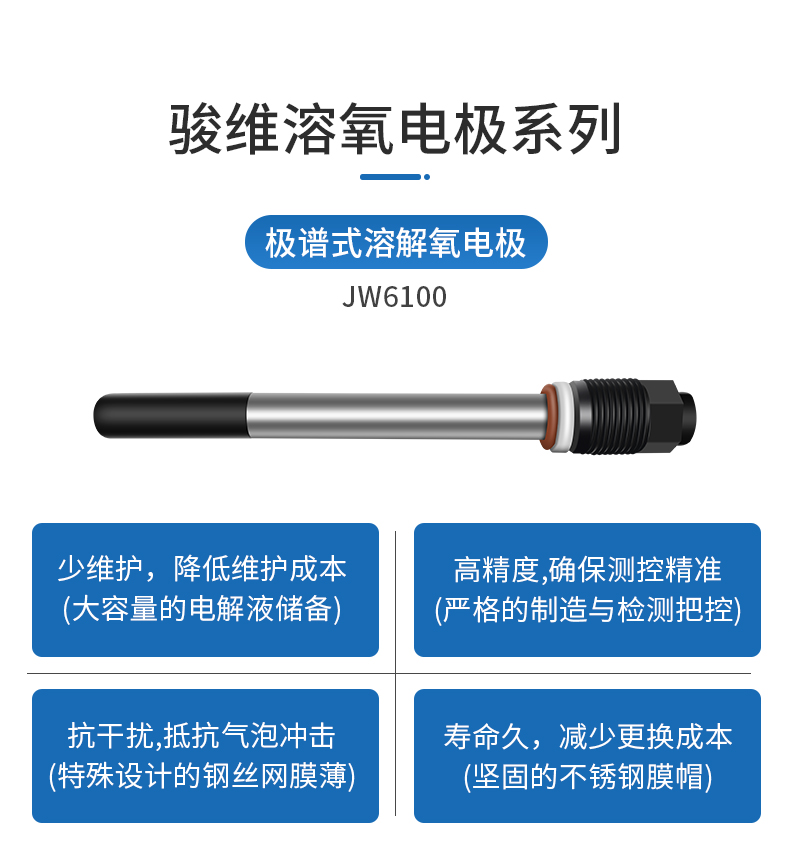 JW6100溶解氧电极是极谱式溶解氧传感器,其膜套采用PTFE/硅氧膜+不锈钢钢丝网形式,用特殊工艺加工成型,膜套牢固,性能可靠,测定数据稳定,能够以较低的价格提供最佳的测量准确度。