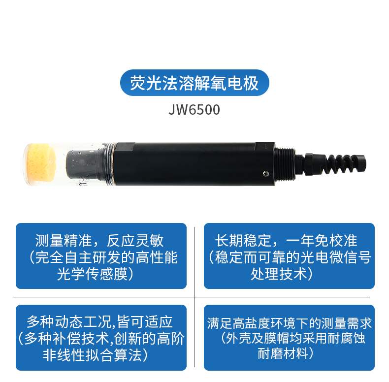 JW6500溶解氧电极是荧光法电极,其采用完全自主研发的高性能光学传感膜,测量精准,反应灵敏,稳定而可靠的光电微信号处理技术使得测量数据稳定,一年免校准。多种补偿技术,创新的高阶非线性拟合算法使电极可以适用于各类工况。外壳及膜帽均采用耐腐蚀耐磨材料可满足高盐度环境下得测量需求。