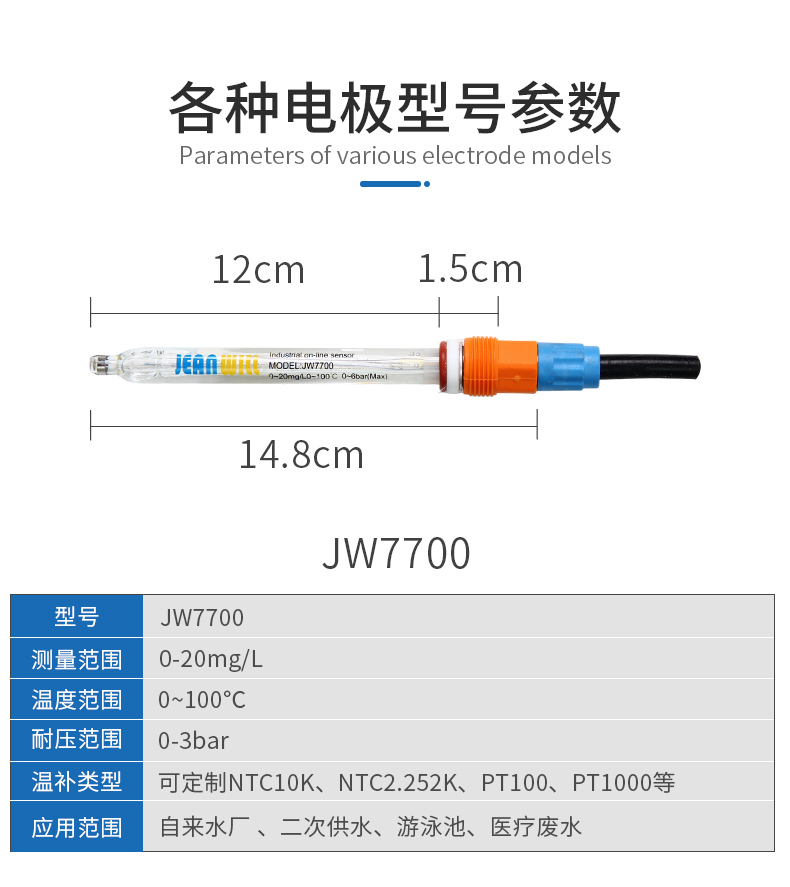 JW7700 余氯电极为恒电压法余氯电极,其采用高纯度大面积铂金环+铂金片核心测量组件保障实时测量的精准稳定,参比系统延用了工业级pH电极的参比,使得其在自来水等净水场合的测量寿命和稳定性大大提升,在需要测量余氯值的各种介质中均可以达到让客户满意的效果,同时还可耐长期的高温。