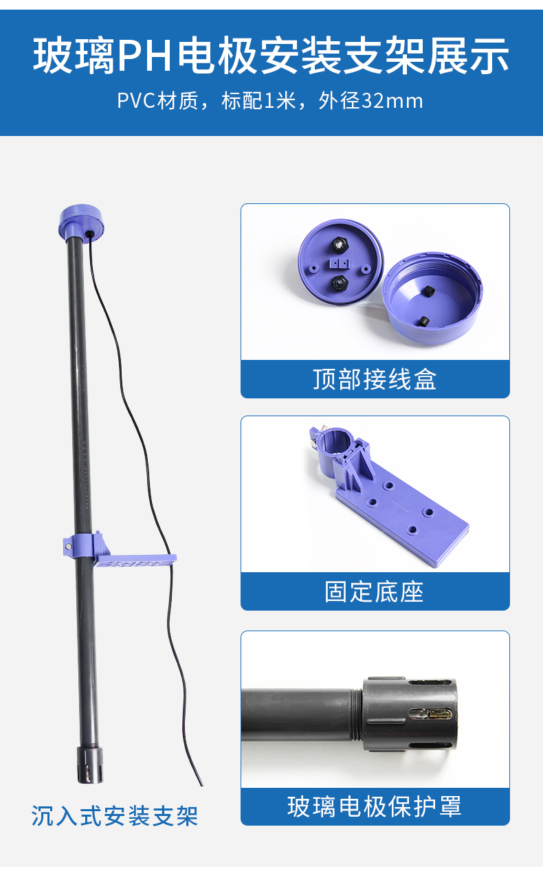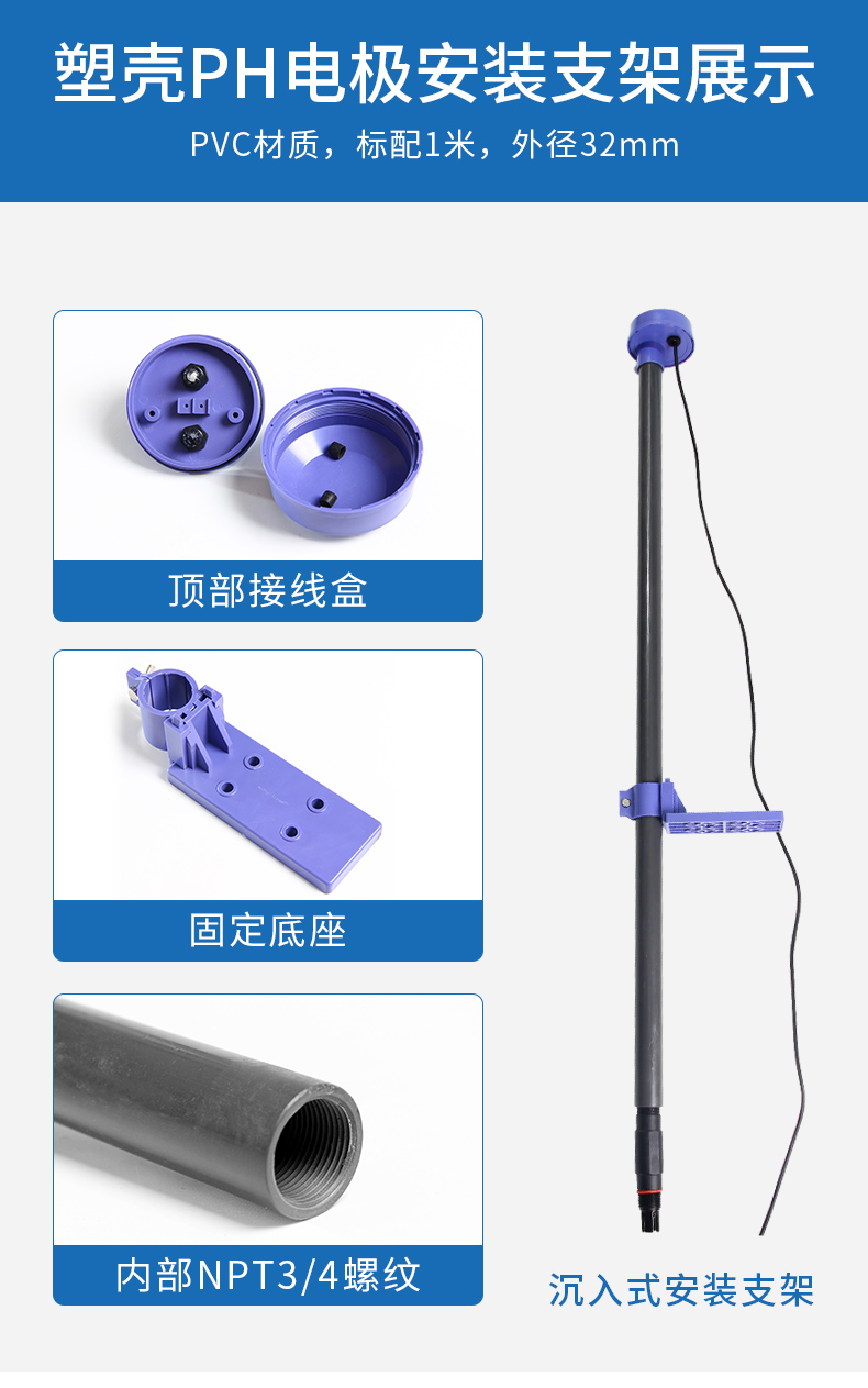 PH电极支架通常应用于水池类工况现场进行安装,其插入深度可调节,材质为PVC塑料,耐腐蚀性佳,经常配合PH电极进行固定安装,以保证测量的稳定性。