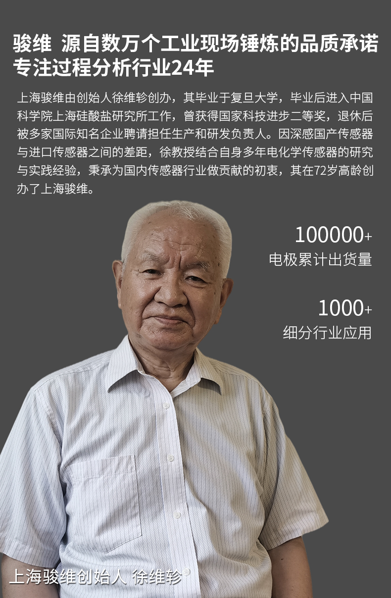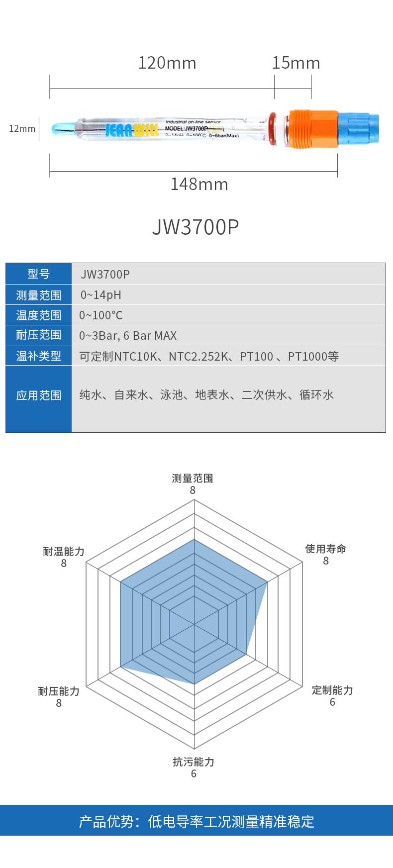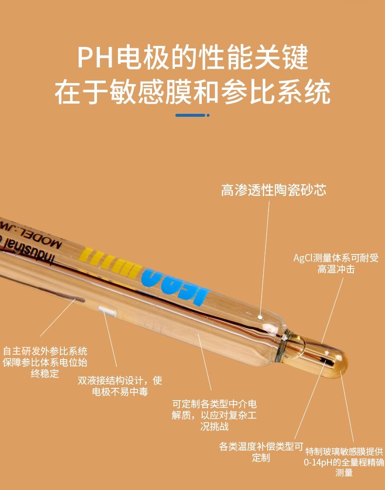 JW3700P pH电极的敏感膜为低阻抗圆柱形敏感膜,既抗机械冲击,又适用于纯水、自来水、地表水等净水介质的测量,较好地平衡了测量精度、响应时间以及电极寿命之间的关系,将实验室电极与工业级电极的优势合二为一。