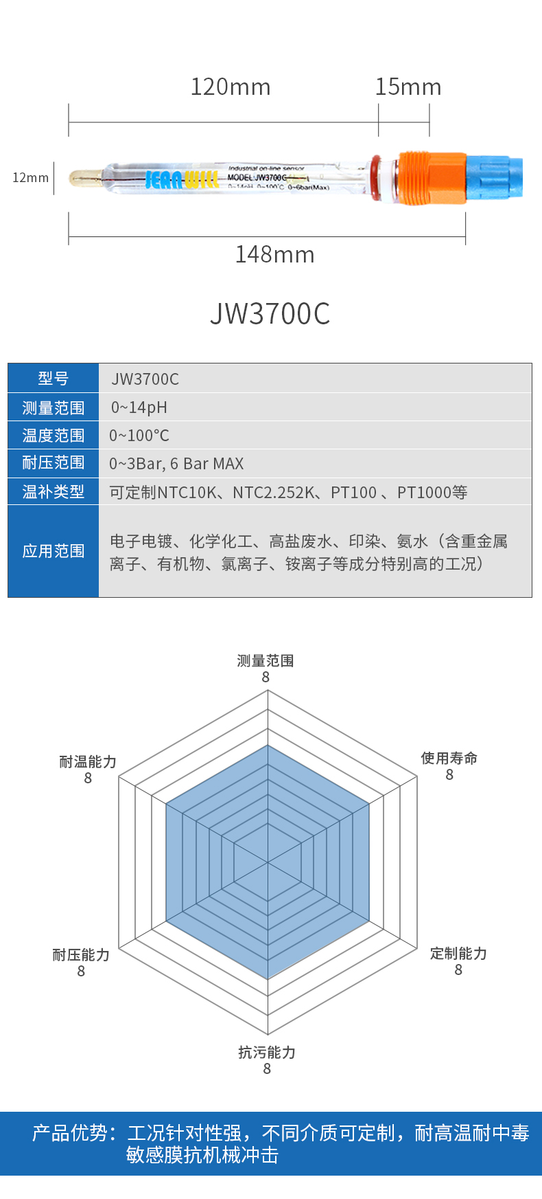 JW3700C pH电极在JW3700的基础上衍生出多种不同的中介电解质,使其可在极其特殊的测量介质中可以保证正常的pH测量以及超长的使用寿命,可胜任市面上常规电极无法良好适用的高盐、高重金属离子、高有机物、高铵离子等场合。