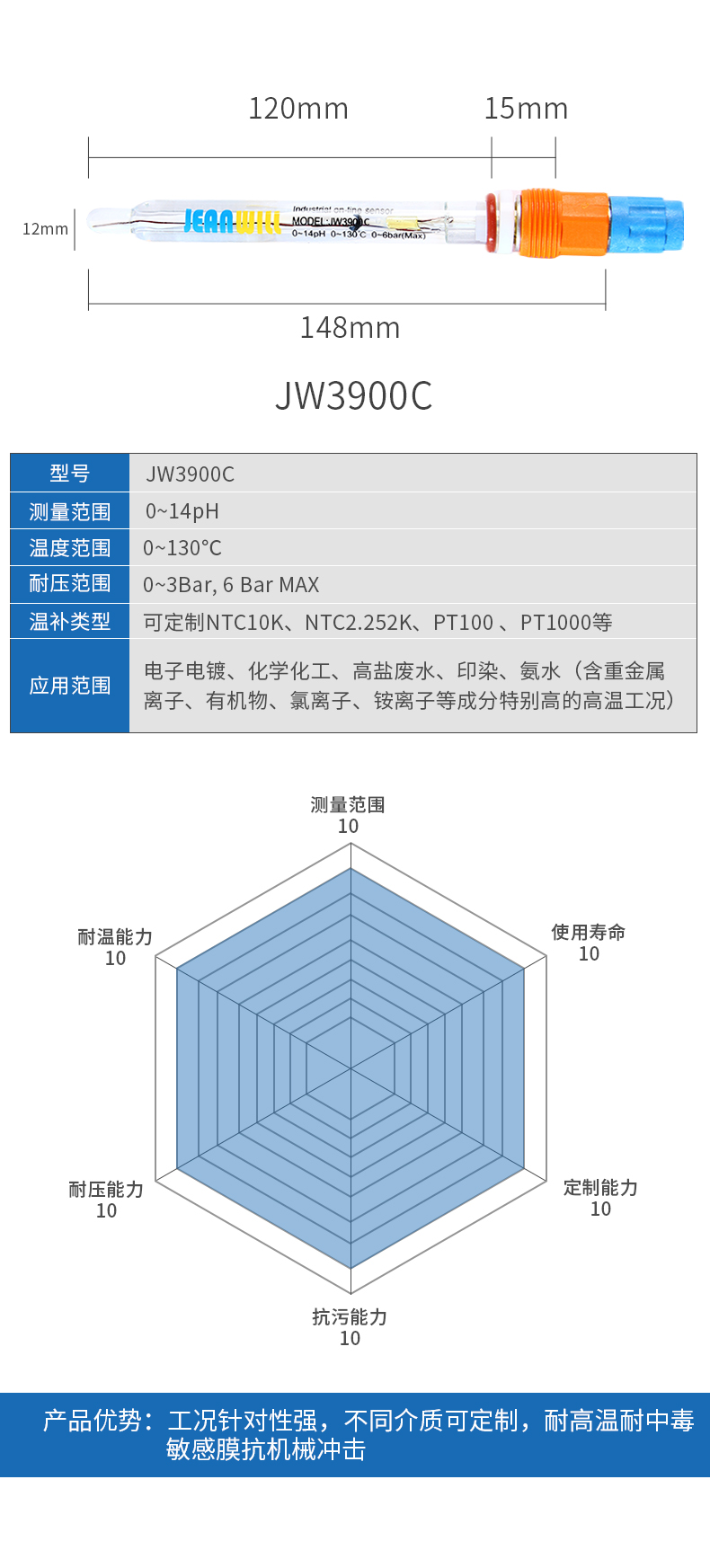 JW3900C pH电极在JW3900的基础上衍生出多种不同的中介电解质,使其可在极其特殊的测量介质中可以保证正常的pH测量以及超长的使用寿命,可胜任市面上常规高温电极无法良好适用的高盐、高重金属离子、高有机物、高铵离子等高温严苛场合。