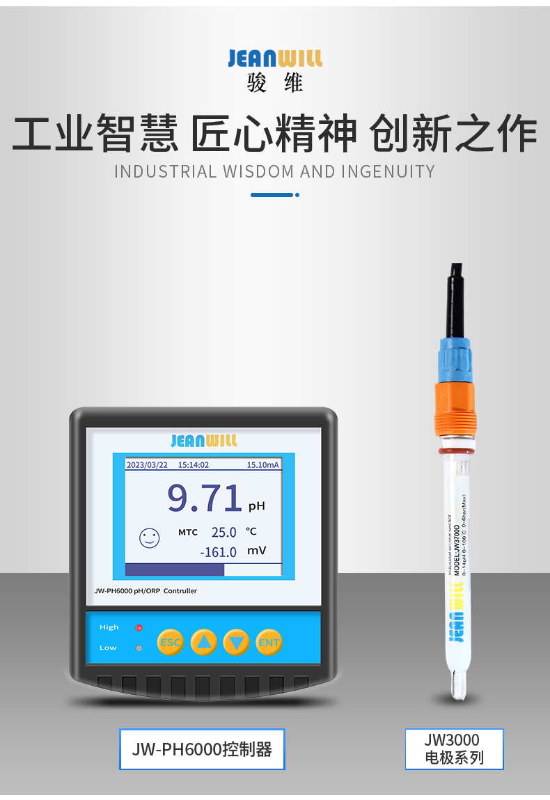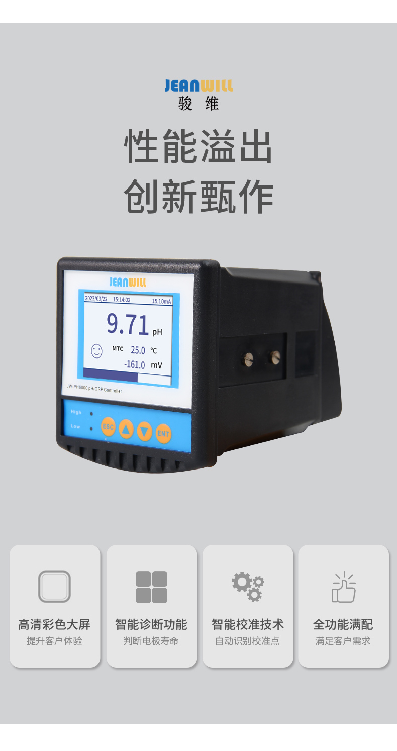 JW-PH6000 PH/ORP变送器采用小型化设计,可与模拟型 pH 或 ORP 电极配套使用,具备测量、显示、变送、报警及通讯功能,可灵活满足各类在线 pH或 ORP 监控需求,其采用LCD高清彩色液晶屏显示,中英文可切换智能菜单,给客户提供了简单且友好的操作,并可适应各类工况现场的严苛要求。